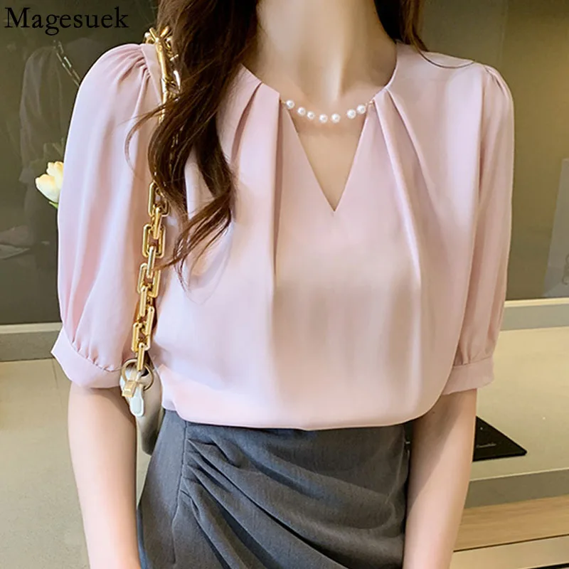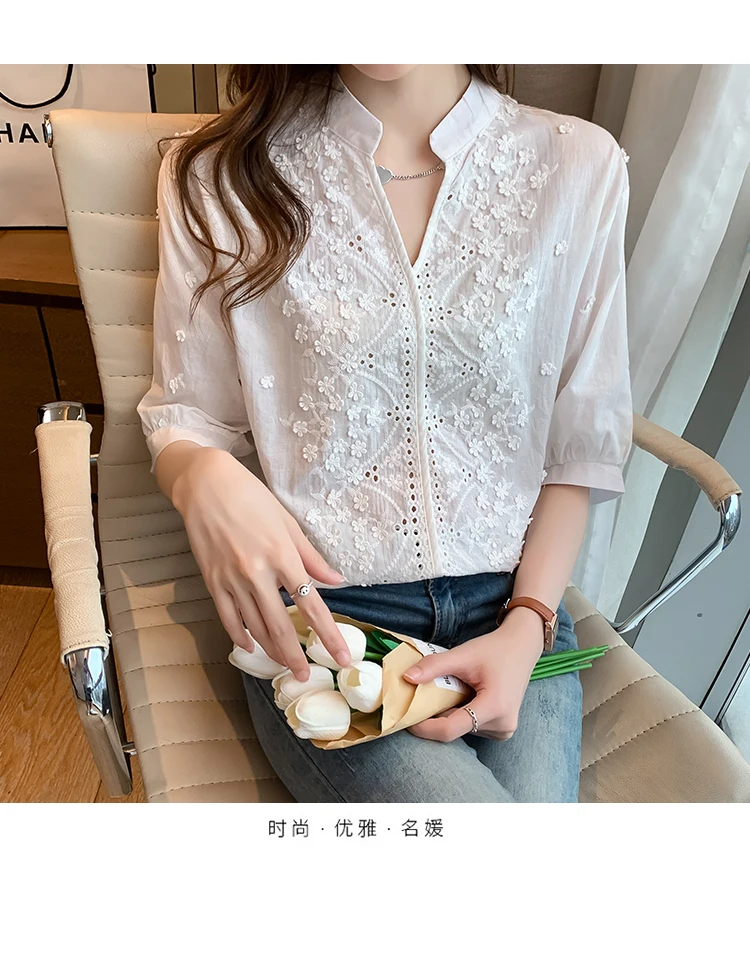 Summer Floral Embroidery Lace Blouse Women Hollow-out Stand Collar V Neck Casual Shirt Elegant Short Sleeve Cotton Tops 24350